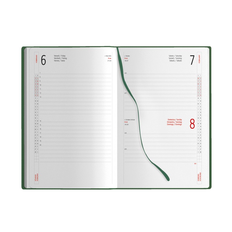 agenda giornaliera sab. e dom. abbinati - 320 pag copertina in PU edizione multilingue: IT - GB - FR - DE - ES - PT segnapagine ed elastico in tinta inserto cartografico - Dimensioni: cm 14,5x21 ca (chiuso) su richiesta astuccio AS010  - Materiale: poliuretano termovirante