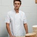 65% poliestere 35% cotone twill. Giacca da Chef dal tessuto morbido, collo alla coreana con impunture, manica corta, bottoni a pressione, stile unisex. Lavabile a 60°C. 195g/m2